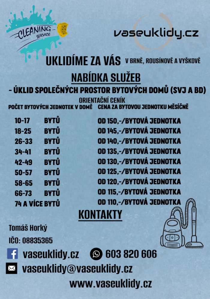 Orientační ceník úklidu společných prostor zahrnuje pouze pravidelné základní úklidové služby (bez mytí oken), které zajišťují běžnou čistotu, pořádek a dlouhodobě udržovaný stav společných částí domu.